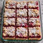 The image shows a glass baking dish holding nine square slices of crumb-topped berry bars arranged in three rows. Each square has three visible layers: a light golden-brown crumbly base, a thick middle layer of bright red berry filling with visible seeds and small chunks, and a top layer of golden crumb clusters sprinkled with powdered sugar. The bars have a rough texture on top with uneven crumb pieces, and the berry layer looks juicy and dense. The dish is set on a white marbled surface. Photo taken with an iphone --ar 4:5 --v 7
