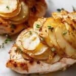 Two pieces of cooked chicken breast are topped with thin, overlapping slices of golden-brown potatoes arranged like flower petals in layers, with a slightly crispy texture on the edges. Small green herb leaves are sprinkled on top, adding a fresh touch. The chicken has a shiny, glazed surface with a mix of light beige and golden brown colors from cooking. The dish is shown on a white marbled surface, emphasizing the warm colors of the food. photo taken with an iphone --ar 4:5 --v 7