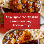 This Apple Pie Dip with Cinnamon Sugar Tortilla Chips is a delightful, comforting treat perfect for snacking or dessert. Creamy and tangy apple dip made from tender cooked apples, sweetened with cinnamon and brown sugar, paired with crispy cinnamon-sugar coated tortilla chips baked to golden perfection, offers a fun and delicious way to enjoy classic apple pie flavors without the fuss of baking a pie.