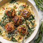 Delight in this comforting dish featuring tender baked chicken meatballs paired with creamy Parmesan spinach orzo. Enhanced by a fragrant herb garlic white wine butter sauce and crispy sage and rosemary leaves, this recipe combines fresh herbs and rich flavors for a satisfying dinner that’s simple to prepare but elegant enough for guests.