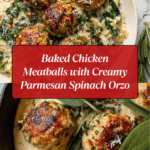 Keywords: Baked chicken meatballs, creamy orzo, Parmesan spinach orzo, white wine butter sauce, herb chicken meatballs, comforting dinner, easy weeknight meal, healthy chicken meatballs