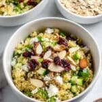 A fresh and vibrant cranberry quinoa feta salad combining fluffy quinoa, tangy feta cheese, sweet dried cranberries, and crunchy slivered almonds, all tossed in a zesty honey lemon Dijon dressing. Perfect as a light lunch or a flavorful side dish.