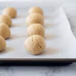 The image shows a baking tray with two rows of beige dough balls evenly spaced on a white parchment paper. The dough balls have a smooth texture with slight cracks and appear soft and raw. The tray is placed on a surface with a white marbled texture, which adds a clean and bright background. The dough balls are the focus, with the closest one sharp and the others progressively blurred in the back, creating depth. Photo taken with an iphone --ar 4:5 --v 7