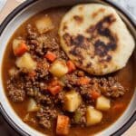 Carne Guisada con Carne Molida y Papas is a hearty Mexican-inspired beef stew made with ground beef, tender fried potatoes, green chiles, and tomatoes simmered to perfection. This flavorful dish is typically served with warm flour tortillas, making it a comforting and satisfying meal for any occasion.