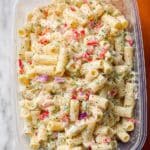 Store the macaroni salad in an airtight container in the refrigerator for up to 3 days. It’s best served cold, so if needed, stir gently and chill again before serving. Avoid freezing, as the creamy dressing may separate upon thawing.