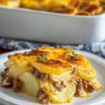 This Cheesy Hamburger Potato Casserole is a hearty and comforting dish perfect for a family dinner. Layers of thinly sliced russet potatoes, savory ground beef, creamy mushroom sauce, and melted cheddar and mozzarella cheese come together for a rich and satisfying casserole that’s easy to prepare and bake in the oven.