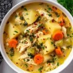 Keywords: comforting chicken soup, chicken soup with potatoes, creamy chicken soup, easy chicken soup recipe, hearty chicken soup, vegetable chicken soup