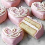 These Copycat Little Debbie Valentines Cakes are delightful white cake hearts layered with a fluffy marshmallow buttercream filling and coated in pink almond bark chocolate. Perfectly festive for Valentine’s Day, these cakes combine tender, moist cake with a creamy filling and a smooth, decorative chocolate shell.