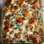 Keywords: chicken casserole, creamy chicken bake, spinach and mushroom bake, easy dinner, comfort food, cheesy chicken dish