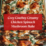 This Cowboy Creamy Chicken Spinach and Mushroom Bake is a comforting and easy-to-make dish perfect for cozy dinners. Packed with tender chicken, fresh spinach, and savory mushrooms in a creamy sauce, it’s topped with melted cheddar for a satisfying meal.