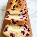 The image shows a loaf of berry-filled bread with two thick slices cut and placed in front. The bread has a golden-brown crust with a soft, fluffy inside that is dotted with dark red berries, creating contrast in color. A creamy, pale yellow cheese layer runs through the center of the loaf and slices, giving a smooth texture against the crumbly bread and juicy berries. The loaf is placed on a wooden board, all set on a white marbled texture. Photo taken with an iphone --ar 4:5 --v 7