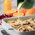 A close-up of a white baking dish filled with six cinnamon rolls that have a reddish fruit filling visible through the swirled layers of pale golden dough. A white sauce is being poured slowly over the cinnamon rolls from a green ceramic pitcher, covering the top of one roll in smooth, creamy liquid. In the background is a glass bottle with orange juice and halved oranges next to some red berries, all resting on a white marbled surface with a black and white cloth underneath the baking dish. Photo taken with an iphone --ar 4:5 --v 7