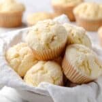 A white bowl lined with a white cloth holds seven pale yellow muffins with crumbly, rough-textured tops showing small lumps and cracks. The muffins are arranged in a slightly piled way, with some facing forward and others at slight angles, revealing their light brown paper liners. In the background, there are blurred similar muffins on a white marbled surface, creating a soft, cozy scene. Photo taken with an iphone --ar 4:5 --v 7