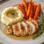 On a white plate with a dotted edge, there is a visually balanced dish with three main parts. On the bottom right, three thick slices of golden brown roasted chicken breast sit in a creamy light brown gravy, showing a slightly crispy outer texture and juicy inside. Behind the chicken, towards the top right, is a pile of bright orange glazed baby carrots, sprinkled with green herbs, looking tender and shiny. On the left side of the plate, there is a smooth mound of creamy mashed potatoes with a small well in the center filled with the same gravy, garnished with a sprig of fresh green rosemary. A full sprig of rosemary lies beside the chicken on the bottom right edge, adding color and detail. The background is a white marbled texture. photo taken with an iphone --ar 4:5 --v 7