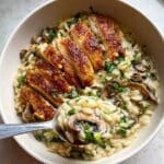 This creamy mushroom and spinach orzo is a comforting one-pan dish featuring sautéed baby bella mushrooms, tender orzo pasta simmered in a flavorful blend of chicken broth and cream, finished with parmesan cheese and fresh spinach and parsley. Perfect for a cozy dinner, it combines earthiness and creaminess in every bite.