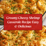 This Shrimp Casserole recipe is a comforting and flavorful dish featuring tender shrimp baked with creamy sour cream, mayonnaise, and cheddar cheese, combined with cooked white rice and topped with a buttery breadcrumb crust. It’s an easy-to-make, crowd-pleasing casserole that’s perfect for weeknight dinners or family gatherings.