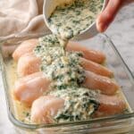 - Garnish and serve: Sprinkle chopped fresh parsley or additional spinach over the top for color. Serve the creamy spinach Parmesan sauce over the chicken directly from the casserole dish with your favorite sides.