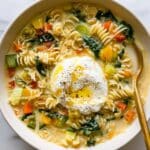 This Creamy White Lasagna Soup with Veggies is a comforting and flavorful twist on classic lasagna, served in a cozy soup form. Loaded with fresh vegetables like yellow squash, zucchini, carrots, and spinach, combined with savory sun-dried tomatoes and Italian seasonings, this hearty soup is enriched with creamy ricotta, parmesan, and pesto. Perfect for a warming meal, it captures the essence of lasagna with the ease and comfort of a soup.