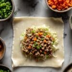 5. Step 5: Lay an egg roll wrapper flat with one corner pointing toward you (diamond shape). Place 2–3 tablespoons of the filling near the bottom corner.