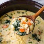 A comforting and creamy Crockpot Chicken Gnocchi Soup featuring tender shredded chicken, hearty vegetables, potato gnocchi, and fresh spinach all simmered to perfection in a flavorful broth enriched with cream and Parmesan cheese.