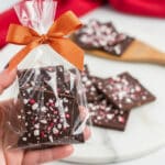 A woman's hand is holding a clear plastic bag tied with a shiny orange bow at the top, filled with several pieces of dark chocolate bark. The chocolate pieces are dark brown with a smooth and glossy texture, scattered with small crushed white and pink peppermint candy bits. In the background, there is a white marbled surface with a blurred wooden spatula topped with more chocolate bark and peppermint pieces, and a red cloth adding color behind the treats. Photo taken with an iphone --ar 4:5 --v 7