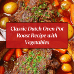 This Dutch Oven Pot Roast is a classic, comforting meal featuring a tender chuck roast slow-cooked to perfection with aromatic herbs, savory vegetables, and a rich beef broth. Enhanced with a flavorful sear, red wine reduction, and a medley of baby carrots and potatoes, this hearty dinner is perfect for cozy family gatherings or a special Sunday meal.