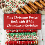These Easy Christmas Pretzel Rods are a festive and delicious treat perfect for holiday celebrations. Crispy pretzel sticks dipped in creamy melted white chocolate and decorated with colorful holiday sprinkles make for a fun and simple sweet snack that’s great for gifting or party tables.