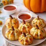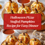 These Easy Pizza-Stuffed Pumpkins are a fun and festive Halloween dinner idea. Tender biscuit dough is filled with a creamy cheese mixture, shaped into pumpkin forms with kitchen twine, baked to golden perfection, and finished with a garlic butter glaze. Pretzel sticks serve as pumpkin stems and the dish is served with marinara sauce for dipping. This recipe is perfect for a playful and delicious Halloween meal.