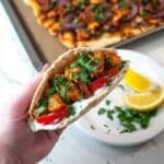 Keywords: sheet pan chicken shawarma, chicken shawarma recipe, easy chicken shawarma, Mediterranean chicken, high protein dinner, gluten free dinner, meal prep chicken, baked chicken thighs