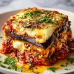 This Eggplant Lasagna is a delicious, low-carb alternative to traditional pasta lasagna, featuring layers of tender baked eggplant, creamy ricotta cheese, tangy marinara sauce, and melted mozzarella and Parmesan cheeses. Perfect for a hearty vegetarian meal packed with rich Italian flavors.