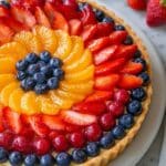 A fresh fruit tart featuring a buttery sweet tart crust filled with creamy pastry cream and topped with a vibrant mix of fresh berries and fruit, finished with a glossy apricot glaze for an elegant and delicious dessert perfect for any occasion.