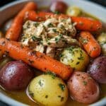 This Garlic Butter Chicken Crockpot recipe is a simple, hands-off dish that delivers tender, flavorful chicken combined with baby red potatoes and carrots. Slow-cooked to perfection in a savory garlic butter sauce infused with Italian seasoning, it makes for a comforting and hearty meal perfect for busy days.