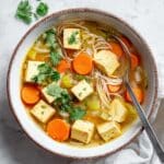 Keywords: Garlic ginger soup, tofu noodle soup, vegan soup, easy vegan recipes, ginger garlic broth, rice noodles soup