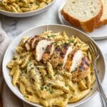 - Combine Pasta and Sauce: Add the cooked pasta to the skillet with the sauce and toss to coat evenly in the creamy garlic Parmesan sauce. Layer the sliced chicken on top of the pasta.