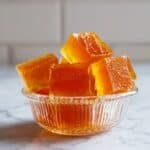 The image shows a clear glass bowl filled with nine translucent amber-colored jelly cubes that have a shiny, slightly textured surface. The cubes are stacked unevenly, some resting on each other inside the bowl, which is placed on a white marbled surface near a blurred window in the background. The warm light highlights the glossy, smooth edges of the jelly cubes, giving them a fresh and appetizing look. Photo taken with an iphone --ar 4:5 --v 7