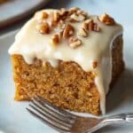 A single square piece of moist, light brown cake sits on a white plate with a silver fork beside it. The cake has a soft, crumbly texture with visible tiny air pockets. It is covered with a thick layer of smooth, creamy beige frosting that drips slightly down the sides. On top of the frosting, there are chopped pecan pieces scattered, giving a crunchy contrast. The plate is placed on a white marbled surface, and the background is softly blurred. photo taken with an iphone --ar 4:5 --v 7