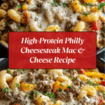 Keywords: Philly Cheesesteak, Mac and Cheese, High Protein, Comfort Food, Ground Beef, Creamy Pasta, Weeknight Dinner