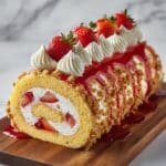 This Homemade Strawberry Shortcake Cheesecake is a delightful dessert that combines a soft strawberry-infused sponge cake rolled with a creamy cheesecake filling, all coated in a golden Oreo and strawberry gelatin crumble. Perfectly garnished with fresh strawberries, whipped cream, and strawberry sauce, it offers a stunning visual and a luscious blend of flavors reminiscent of classic strawberry shortcake with a decadent cheesecake twist.