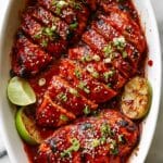 The image shows a white oval dish filled with several grilled chicken breasts covered in a thick, shiny red sauce. Each chicken breast is cut with neat diagonal slits, revealing tender meat underneath. Green chopped scallions and white sesame seeds are sprinkled on top, adding pops of color and texture. Around the edges of the dish are bright green lime wedges and a grilled lemon slice, giving freshness to the rich look of the chicken. The dish sits on a white marbled surface, enhancing the vibrant colors of the food. photo taken with an iphone --ar 4:5 --v 7