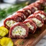 1. Prepare Cream Cheese Mixture: In a small bowl, thoroughly mix the softened cream cheese with finely diced dill pickles, chopped green onions if using, and garlic powder or Italian seasoning until fully combined into a smooth, flavorful spread.