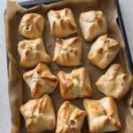 A tray filled with thirteen square-shaped baked pastries with a lightly golden brown crust. Each pastry has edges folded over, slightly pinched at the top center, creating small peaks and folds with bursts of white creamy filling visible through the openings. The pastries rest on light brown parchment paper, placed inside a dark baking tray. The surface underneath appears to be a white marbled texture. photo taken with an iphone --ar 4:5 --v 7