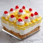 This Juicy Pineapple Heaven Cake is a light, airy dessert that combines the fluffy texture of angel food cake with the tropical sweetness of crushed pineapple. Topped with a creamy vanilla pudding and whipped topping mixture, and garnished with cherries and shredded coconut, this cake is perfect for a refreshing treat or a festive occasion.