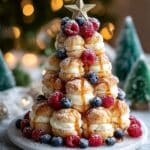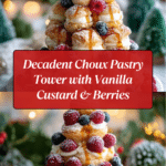 This layered choux pastry tower is a stunning dessert that combines airy puffs filled with creamy vanilla custard, drizzled with rich caramel, and topped with fresh berries. It’s perfect for special occasions or whenever you want a show-stopping treat that’s surprisingly easy to assemble.