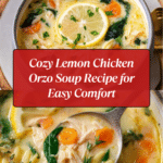 This comforting Lemon Chicken Orzo Soup is a flavorful, hearty dish perfect for any season. Featuring tender shredded rotisserie chicken, tender orzo pasta, fresh spinach, and a bright zing of lemon, this soup offers a perfect balance of savory and citrusy notes. The soup is thickened with a cornstarch slurry for a silky texture and enriched with aromatic herbs like thyme and fresh garlic. Ideal for a wholesome lunch or dinner, it’s simple to prepare in one pot with fresh vegetables and wholesome broth.