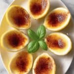 Six small lemon-shaped shells filled with a smooth, creamy dessert that has a caramelized, golden-brown, slightly cracked top layer are arranged in a circle on a white round plate. In the center of the plate, there are three fresh green basil leaves adding a pop of color. The lemon shells have a bright yellow rind with a white inner lining, contrasting with the rich caramel color on top of each dessert. The setup is on a white marbled surface. photo taken with an iphone --ar 4:5 --v 7