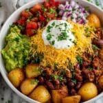 This Loaded Potato Taco Bowl combines crispy roasted potatoes with a flavorful spiced ground beef or turkey mixture, black beans, corn, cheddar cheese, and fresh toppings like avocado, cherry tomatoes, and cilantro. It’s a hearty, satisfying Tex-Mex inspired dish perfect for a comforting weeknight dinner.