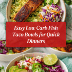 This Low Carb Fish Taco Bowls recipe features tender baked cod fillets seasoned with a flavorful taco spice blend, served over pineapple lime cauliflower rice and sweet and spicy coleslaw. Topped with creamy honey lime crema, avocado slices, and fresh cilantro, this healthy and delicious dish is perfect for a light, satisfying meal that’s low in carbs and packed with vibrant flavors.