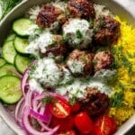 Keywords: Mediterranean meatballs, rice bowl, tzatziki, basmati rice, fresh veggies, easy dinner, Greek inspired