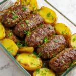 This mouthwatering Tahini Kofta recipe features spiced ground beef or lamb shaped into tender oval logs, baked with thinly sliced potatoes and topped with a creamy, tangy tahini sauce. A flavorful and comforting Middle Eastern-inspired meal perfect for a satisfying dinner.
