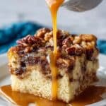 A thick square piece of bread pudding is placed on a white plate, showing two visible layers: the bottom layer is a light, fluffy cake with a slightly browned edge, and the top layer is rich with a mix of dark brown nuts and melted bits, giving a textured and sticky look. A smooth, golden caramel sauce is being poured over the pudding from above, dripping down the sides and pooling around the base, enhancing the glossy, moist appearance. The background is a white marbled texture, and there is a blurry hint of blue cloth under the plate. Photo taken with an iphone --ar 4:5 --v 7